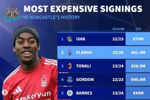 德转列纽卡队史引援榜:伊萨克7000万,伊兰加、托纳利、戈登在列