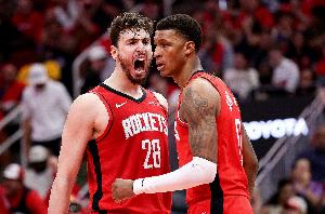 上半场比赛,火箭三分13中8(申京2中2、谢泼德小贾巴里和JD-戴维森皆3中2),老鹰三分15中8(特雷-杨、亚历山大-沃克和肯纳德皆3中2)。
