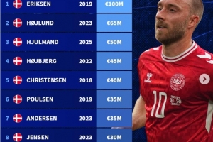 丹麦球员历史身价榜:埃里克森1亿欧居首,霍伊伦6500万欧第二