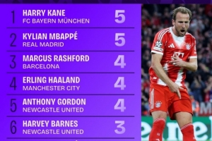 体育资讯10月23日讯 本赛季欧冠联赛阶段已战罢3轮,Squawka统计了到目前为止欧冠进球数,拜仁前锋凯恩和皇马攻击手姆巴佩都打进5球,分列前二位。