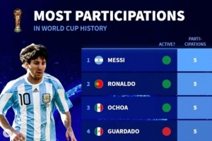 再战一届?德转列已参加5届世界杯球员:现役仅梅西、C罗、奥乔亚
