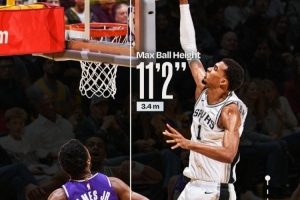 不过在比赛中,他仍有十佳球表现。NBA官方发布了他隔扣布朗尼一球的两项数据,其中球的最高点达到了3.4米,而文班亚马这一扣的滑行距离达到2.2米。