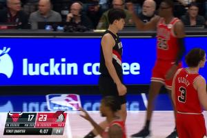 NBA常规赛,开拓者坐镇主场迎战公牛,首节进行到4分07秒时,中锋杨瀚森替补登场。